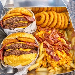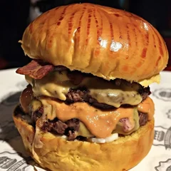 Experimente nossa incrível combinação de sabor: pão fresquinho, 2 hambúrgueres artesanais suculentos, 2 generosas porções de cheddar, bacon crocante, anéis de cebola fritos, delicioso barbecue e maionese. Uma explosão de sabores em cada mordida!